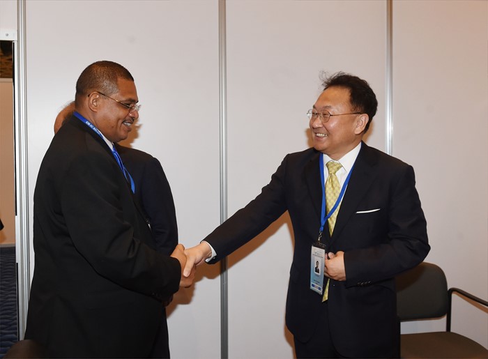 (서울=포커스뉴스) 2016년 IDB 연차총회 참석차 바하마 낫쏘를 방문중인 유일호 부총리 겸 기획재정부 장관이 10일(현지시간) 아코스타 몬딸반 니카라과 재무장관과 양자회담에 앞서 악수를 하고 있다. <사진제공=기획재정부>