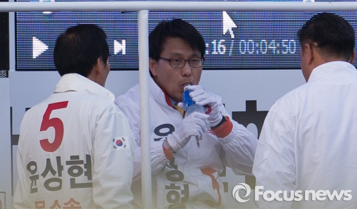 (인천=포커스뉴스) 20대 총선을 이틀 앞둔 11일 오후 인천 남구 제물포역 앞에서 윤상현 무소속 남구을 후보가 목을 축이고 있다.