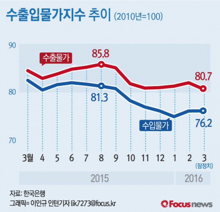(서울=포커스뉴스) 12일 한국은행이 공개한 ‘3월 수출입물가지수'를 보면 지난달 수입물가는 76.20으로 전월 보합을 기록했다. 수출물가는 80.72로 전월 대비 1.5% 하락했다.