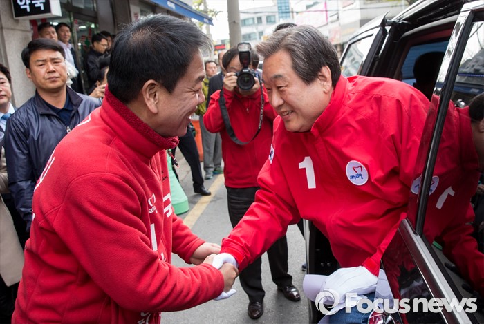 (수원=포커스뉴스) 4.13 총선을 하루 앞둔 12일 오전 경기 수원 정자시장에서 박종희 새누리당 수원시갑 후보 지원유세에 나선 김무성 대표가 박 후보와 악수하고 있다.