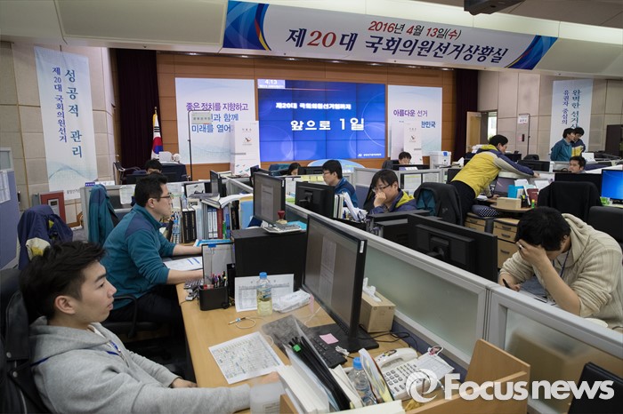 (과천=포커스뉴스) 2016 제20대 국회의원선거를 하루 앞둔 12일 오전 경기도 과천시 중앙선거관리위원회에 설치된 상황실에서 직원들이 업무를 보고 있다.
