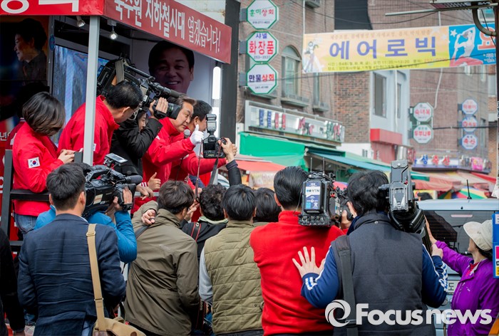 (수원=포커스뉴스) 4.13 총선을 하루 앞둔 12일 오전 경기 수원 정자시장에서 박종희 새누리당 수원시갑 후보 지원유세에 나선 김무성 대표가 유권자들에게 박 후보의 지지를 호소하고 있다.