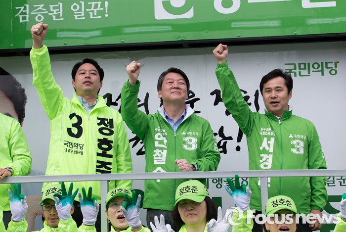 (서울=포커스뉴스) 안철수(가운데) 국민의당 상임공동대표가 12일 오전 서울 성동구 금장시장 앞에서 서경선(오른쪽) 중구성동구갑 후보와 정호준(왼쪽) 중구성동구을 후보 지원유세를 하고 있다.