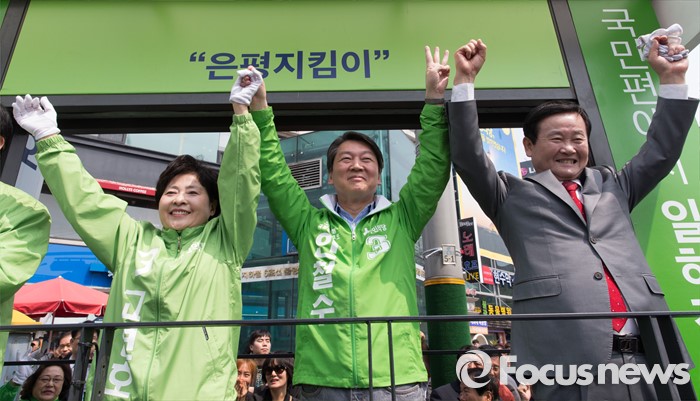 (서울=포커스뉴스) 안철수(가운데) 국민의당 상임공동대표가 12일 오전 서울 은평구 불광역 8번 출구 앞에서 고연호(왼쪽) 은평구을 후보 지원유세를 하고 있다.