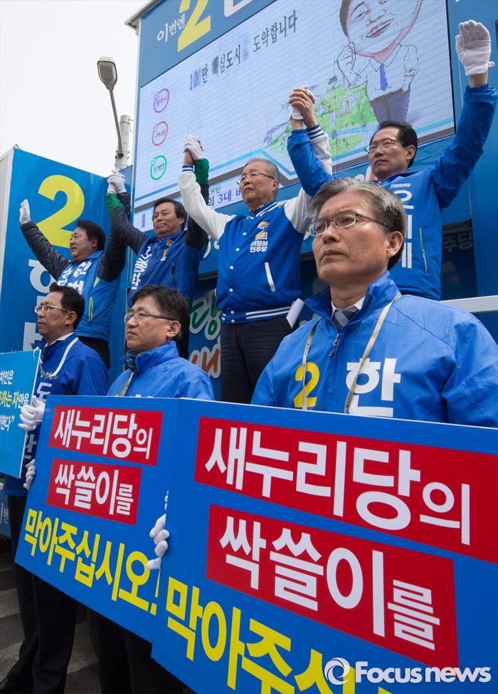 (청주=포커스뉴스) 국회의원 선거를 하루 앞둔 12일 오전 충북 청주 상당구 육거리시장 앞에서 김종인 더불어민주당 대표가 청주지역 후보의 지지를 호소하고 있다.