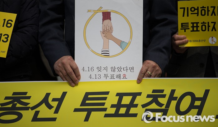 (서울=포커스뉴스) 제20대 국회의원 선거를 하루 앞둔 12일 오전 서울 광화문광장에서 2016 총선시민네트워크 회원들이 총선 투표참여를 호소하는 기자회견을 하고 있다.