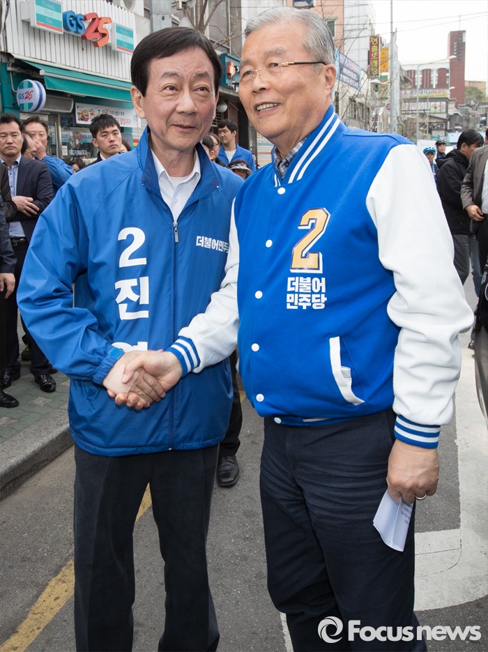 (서울=포커스뉴스) 2016 제20대 국회의원선거를 하루 앞둔 12일 오후 서울 용산구 후암시장 인근에서 김종인 더불어민주당 비대위 대표 겸 선대위원장과 진영 서울 용산구 후보가 악수를 하고 있다.