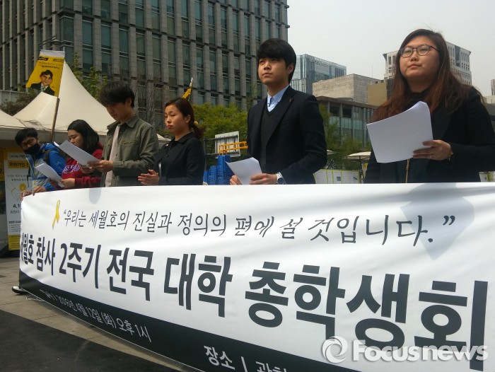 한편 전국 대학 총학생회 대표단은 오는 16일 오후 3시 서울 종로구 대학로 마로니에 공원에서 세월호 참사 2주기를 기념하는 대규모 '전국대학생대회'를 개최하고 추모 행진 등을 진행할 예정이다.전국 대학 총학생회 대표단이 12일 오후 서울 광화문광장에서 기자회견을 열고 정부에 세월호 참사 진상을 규명할 것을 촉구했다. 장지훈 기자 jangpro@focus.co.kr