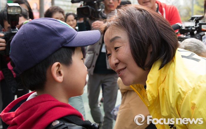(고양=포커스뉴스) 제20대 국회의원 선거를 하루 앞둔 12일 오후 심상정 정의당 고양갑 후보가 경기 고양시 롯데마트 화정점 앞에서 한 아이와 대화 나누고 있다.