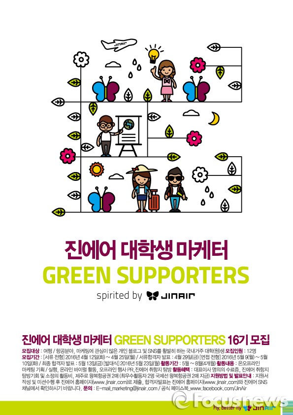 (서울=포커스뉴스) 진에어는 대학생 마케팅 참여 프로그램인 그린서포터즈 16기 12명을 모집한다고 12일 밝혔다.