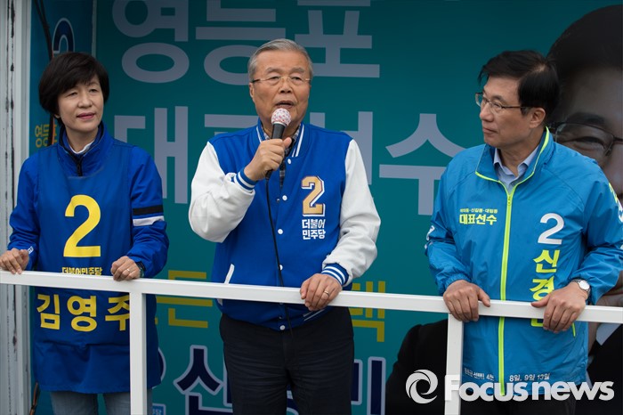 (서울=포커스뉴스) 2016 제20대 국회의원선거를 하루 앞둔 12일 오후 서울 영등포구 신협 도림본점 앞에서 김영주 더불어민주당 영등포갑 후보, 김종인 비대위 대표 겸 선대위원장, 신경민 영등포을 후보가 유권자들에게 지지를 호소하고 있다.
