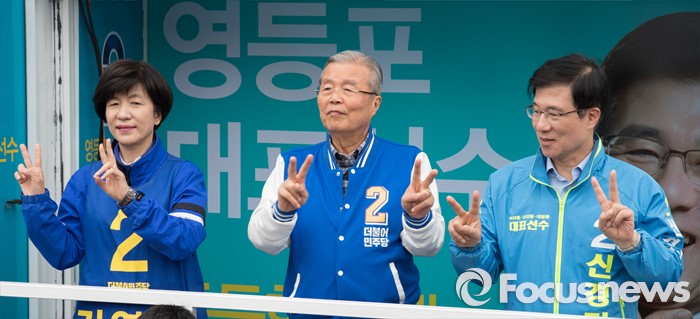 (서울=포커스뉴스) 2016 제20대 국회의원선거를 하루 앞둔 12일 오후 서울 영등포구 신협 도림본점 앞에서 김영주 더불어민주당 영등포갑 후보, 김종인 비대위 대표 겸 선대위원장, 신경민 영등포을 후보가 유권자들에게 지지를 호소하고 있다.