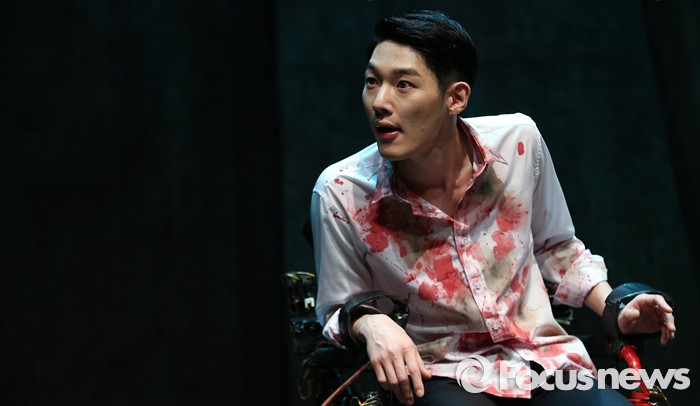 (서울=포커스뉴스) 12일 오후 서울 종로구 아트원씨어터에서 열린 연극 '지구를 지켜라' 프레스콜에 참여한 배우 김도빈이 주요장면을 시연하고 있다.