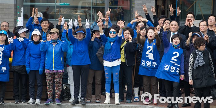 (서울=포커스뉴스) 2016 제20대 국회의원선거를 하루 앞둔 12일 오후 서울 영등포구 신협 도림본점 앞에서 유권자들이 김영주 더불어민주당 영등포갑 후보, 김종인 비대위 대표 겸 선대위원장, 신경민 영등포을 후보의 지지를 호소를 지켜보고 있다.