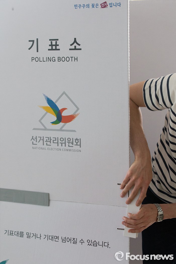 (서울=포커스뉴스) 4.13총선을 하루 앞둔 12일 오후 서울 성북구 보험연수원에 마련된 보문동 제2투표소에서 투표사무원이 기표소를 설치하고 있다.