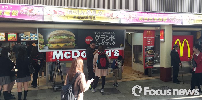 (서울=포커스뉴스) 일본 맥도날드가 광고에서 한국식 인사법을 선보여 논란이 되고 있으며 일본 국내에서는 불매운동 움직임까지 일어나고 있다. 사진은 12일 오후 일본 혼슈 오사카 우메다에 있는 맥도날드의 모습. <사진제공=독자>