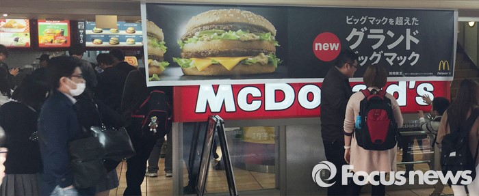 (서울=포커스뉴스) 일본 맥도날드가 광고에서 한국식 인사법을 선보여 논란이 되고 있으며 일본 국내에서는 불매운동 움직임까지 일어나고 있다. 사진은 12일 오후 일본 혼슈 오사카 우메다에 있는 맥도날드의 모습. <사진제공=독자>