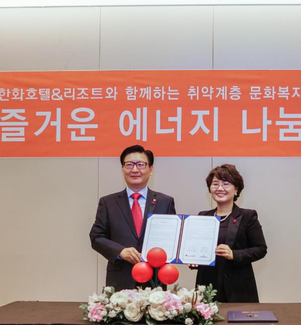 한화호텔앤드리조트 관계자는 "이번 협약을 통해 경제적·심리적 부담으로 여가·문화활동의 기회가 적었던 사회취약계층에게 즐거운 추억을 만들 수 있는 기회를 제공할 뿐 아니라 다양한 문화복지관광 지원 확대에 기여할 것으로 기대된다"고 밝혔다.한화호텔앤드리조트 문석 대표이사(왼쪽)와 최은숙 사랑의열매 사무처장이 '즐거운 에너지 나눔 사업'에 대한 협약을 마친 후 기념촬영하고 있다.<사진제공=한화호텔앤드리조트>