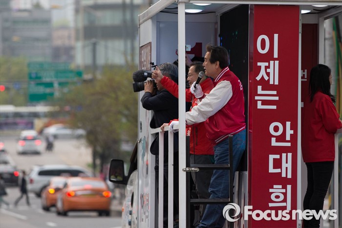 (서울=포커스뉴스) 20대 총선을 하루 앞둔 12일 오후 서울 용산구의 한 아파트 일대에서 김무성 새누리당 대표가 안대희 마포갑 후보 지원유세를 하고 있다.