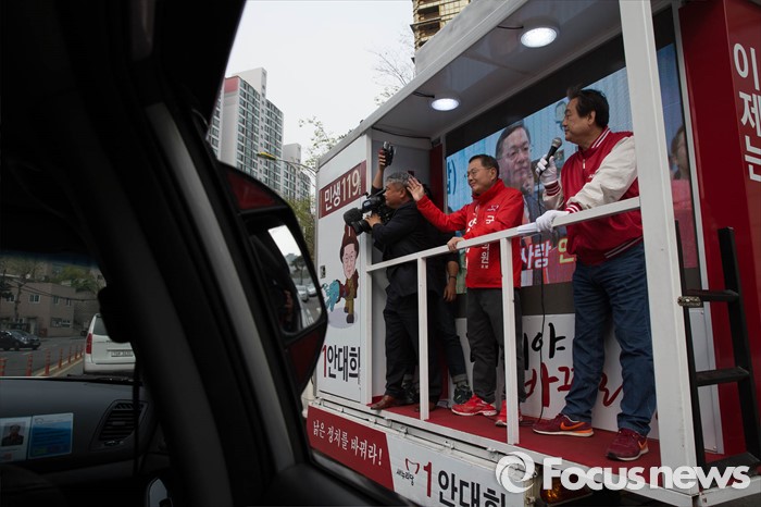 (서울=포커스뉴스) 20대 총선을 하루 앞둔 12일 오후 서울 용산구의 한 아파트 일대에서 김무성 새누리당 대표가 안대희 마포갑 후보 지원유세를 하고 있다.