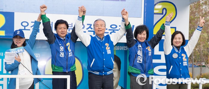 (서울=포커스뉴스) 2016 제20대 국회의원선거를 하루 앞둔 12일 오후 서울 마포구 공덕역 인근 경의선숲길공원에서 노웅래 더불어민주당 마포갑 후보, 김종인 더불어민주당 비대위 대표 겸 선대위원장, 손혜원 마포을 후보가 유권자들에게 지지를 호소하고 있다.