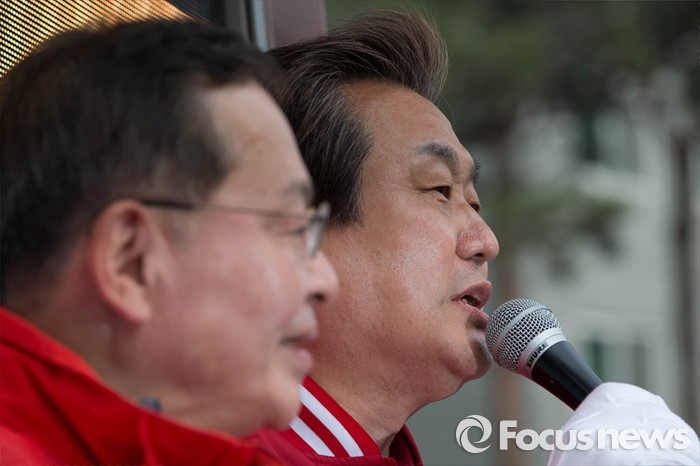 (서울=포커스뉴스) 20대 총선을 하루 앞둔 12일 오후 서울 용산구의 한 아파트 일대에서 김무성 새누리당 대표가 안대희 마포갑 후보의 지지를 호소하고 있다.