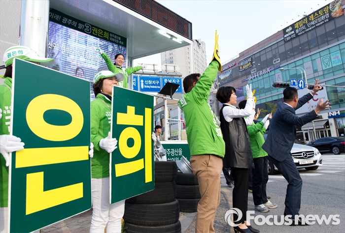(광주=포커스뉴스) 4.13총선을 하루 앞둔 12일 오후 광주 광산구 타이어테크 수완점 앞에서 권은희 국민의당 광산구을 후보 선거운동원들이 지지를 호소하고 있다.
