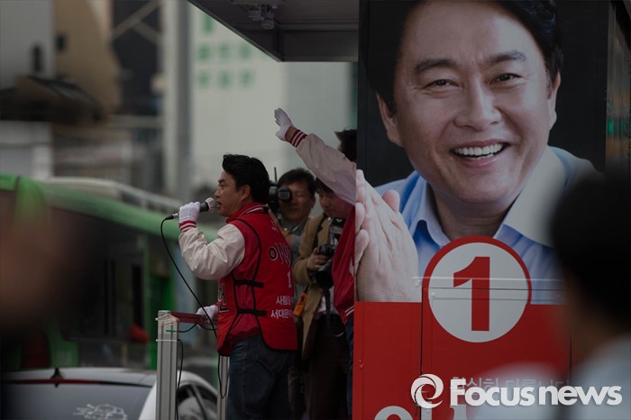 (서울=포커스뉴스) 20대 총선을 하루 앞둔 12일 오후 서울 마포구 신촌역 일대에서 김무성 새누리당 대표와 이성헌 서대문갑 후보가 선거유세를 하고 있다.