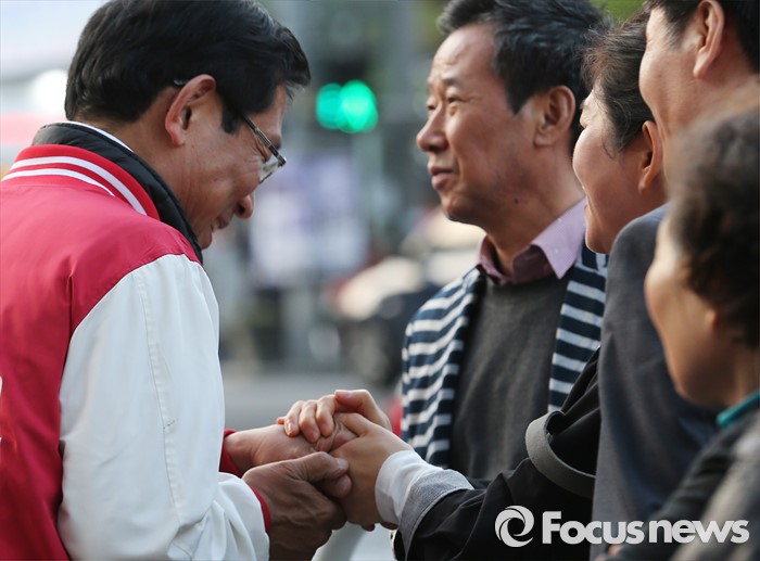 (서울=포커스뉴스) 4.13총선을 하루 앞둔 12일 오후 서울 영등포구 당산역 인근에서 박선규 새누리당 영등포갑 후보가 한 시민과 손을 잡고 있다.