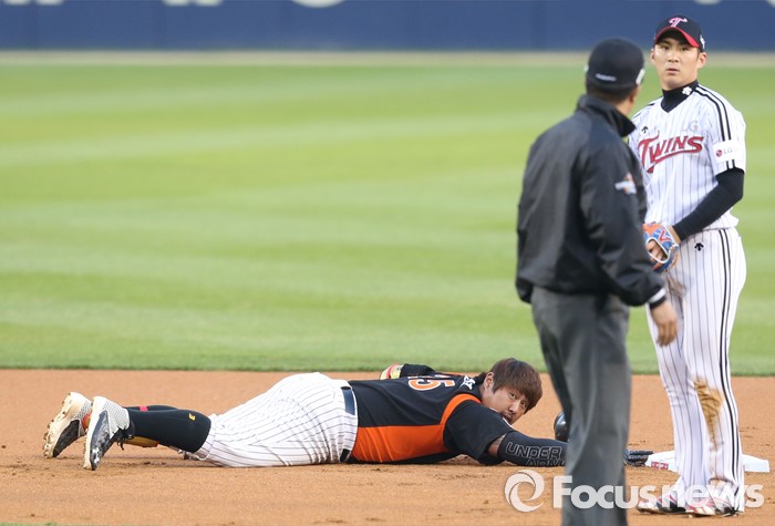(서울=포커스뉴스) 12일 서울 잠실구장에서 열린 2016 프로야구 롯데-LG 경기 1회초 1사 1,3루에서 롯데 최준석이 주자일소 2루타를 치고 2루에서 오버런 하다 세이프되고 있다.