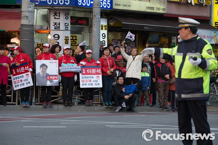 (서울=포커스뉴스) 12일 오후 서울 노원구 GS수퍼마켓 상계점 앞에서 시민들이 이준석 새누리당 노원병 후보자를 지지하는 김무성 새누리당 대표의 발언을 듣고 있다.