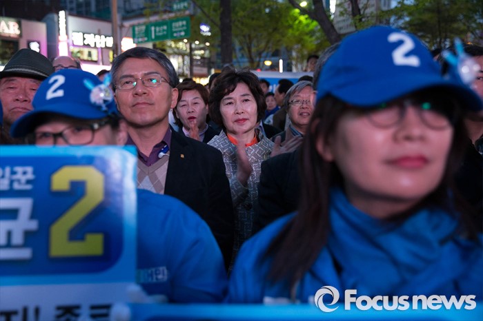 | △ 정세균 유세현장 지켜보는 유권자들 |