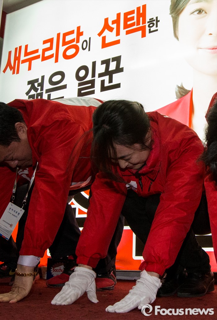 (부산=포커스뉴스) 4.13총선 선거운동 마지막날인 12일 오후 부산 사상구 엄궁초등학교 인근에서 손수조 새누리당 부산 사상구 후보가 유권자들의 지지를 호소하며 큰절하고 있다.