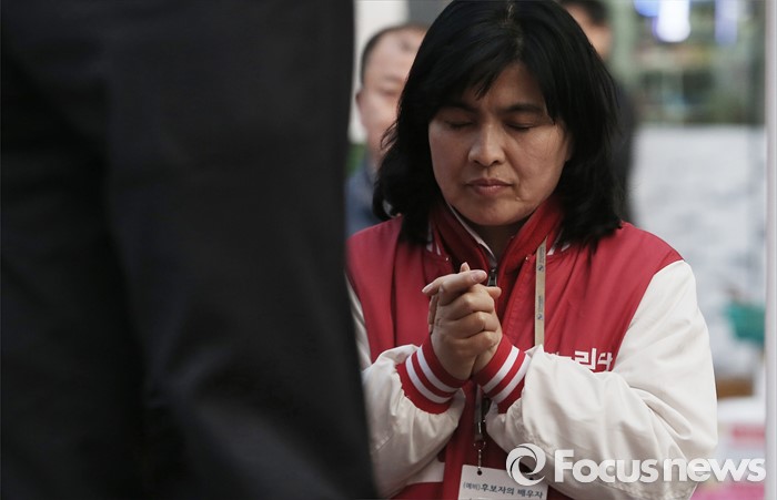 (서울=포커스뉴스) 4.13총선을 하루 앞둔 12일 오후 서울 영등포구 당산역 인근에서 박선규 새누리당 영등포갑 후보의 배우자 박미연씨 가 기도를 하고 있다.