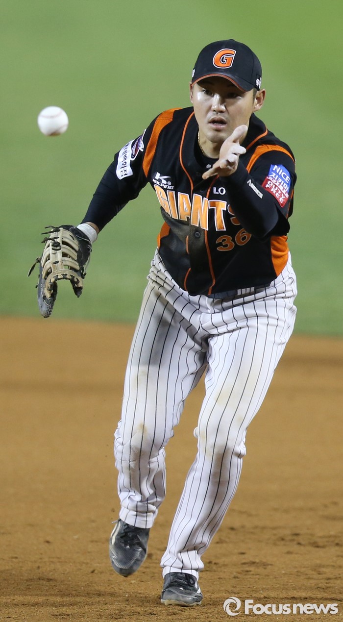 (서울=포커스뉴스) 12일 서울 잠실구장에서 열린 2016 프로야구 롯데-LG 경기 3회말 롯데 1루수 박종윤이 LG 이천웅의 타구를 잡아 1루 커버 들어온 투수 김원중에게 볼을 토스하고 있다.