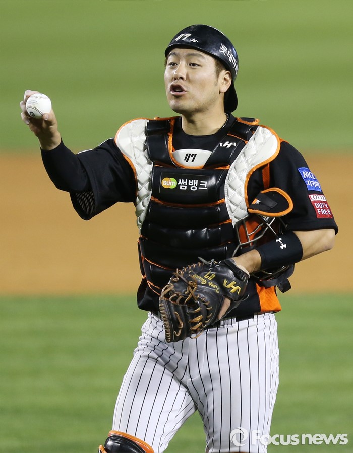 (서울=포커스뉴스) 12일 서울 잠실구장에서 열린 2016 프로야구 롯데-LG 경기 3회말 롯데 포수 강민호가 주심에게 볼을 바꿔달라고 요구하고 있다.