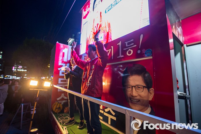 (대구=포커스뉴스) 김문수 새누리당 대구 수성구갑 후보가 12일 오후 대구광역시 수성구 신매광장에서 유세를하며 유권자들에게 한 표를 호소 하고 있다.
