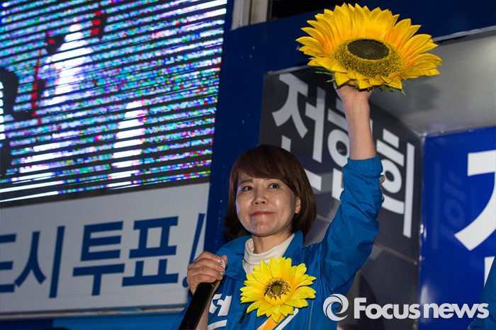 (서울=포커스뉴스) 공식 선거운동이 끝나는 12일 오후 서울 강남구 수서역 앞에서 전현희 더불어민주당 후보가 퇴근길 시민들을 향해 유세를 하고 있다.