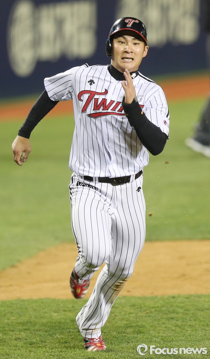 (서울=포커스뉴스) 12일 서울 잠실구장에서 열린 2016 프로야구 롯데-LG 경기 6회말 1사 1루에서 LG 1루주자 오지환이 정주현의 2루타때 3루를 돌아 홈인하고 있다.