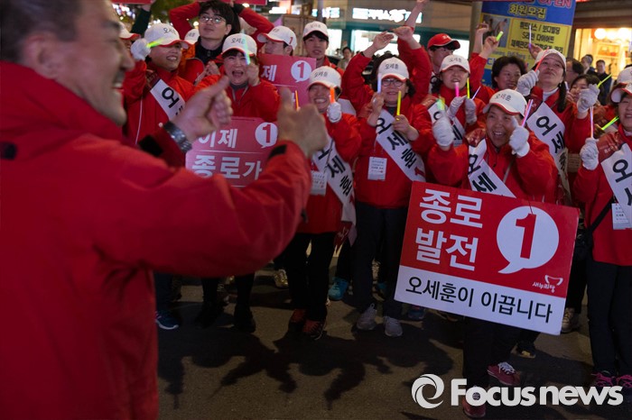 (서울=포커스뉴스) 20대 총선을 하루 앞둔 12일 오후 서울 종로구 경복궁역 일대에서 오세훈 새누리당 종로구 후보측이 막바지 선거유세를 하고 있다.