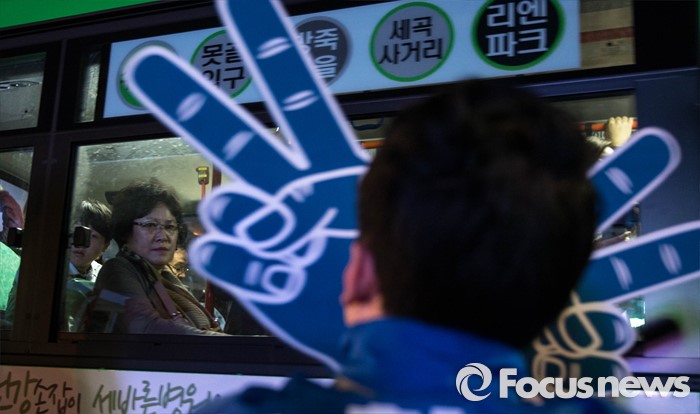 (서울=포커스뉴스) 공식 선거운동이 끝나는 12일 오후 서울 강남구 수서역 앞에서 전현희 더불어민주당 후보와 자원봉사자들이 퇴근길 시민들을 향해 유세를 하고 있다.