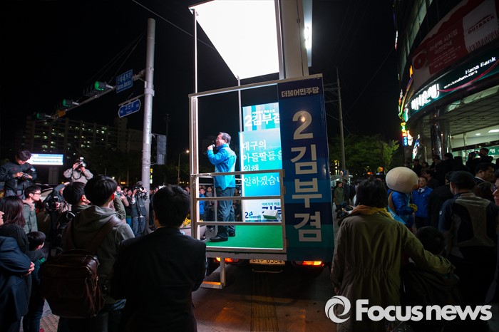(대구=포커스뉴스) 김부겸 더불어민주당 수성구갑 후보가 12일 오후 대구광역시 수성구 신매네거리에서 유세를하며 유권자들에게 한 표를 호소 하고 있다.