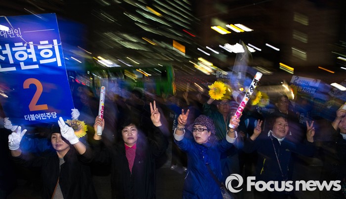 | △ 전현희 유세에 환호하는 시민들 |