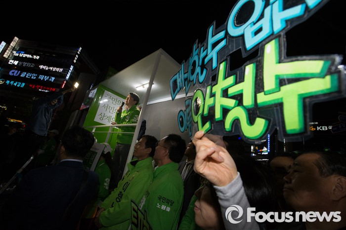 (서울=포커스뉴스) 4.13총선을 하루 앞둔 12일 오후 서울 노원구 롯데백화점 정문 앞에서 안철수 국민의당 상임공동대표가 막바지 선거 유세를 하고 있다.