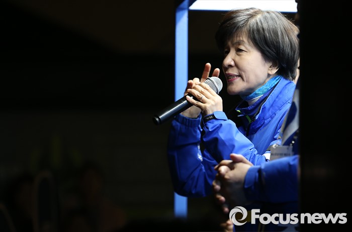 (서울=포커스뉴스) 4.13총선을 하루 앞둔 12일 오후 서울 영등포구 영등포역 인근에서 김영주 더불어민주당 영등포갑 후보가 지지를 호소하고 있다.