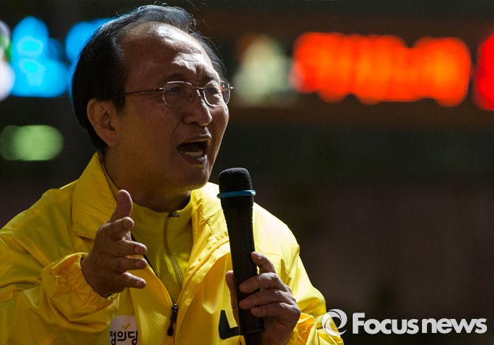 (창원=포커스뉴스) 4.13총선 선거운동 마지막날인 12일 오후 경남 창원시 상남분수광장에서 노회찬 정의당 창원 성산구 후보가 유권자들의 지지를 호소하고 있다.