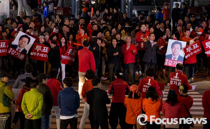 (창원=포커스뉴스) 4.13총선 선거운동 마지막날인 12일 오후 경남 창원시 상남분수광장에서 열린 강기윤 새누리당 창원 성산구 후보 선거유세에 참석한 강 후보 지지자들이 손팻말을 흔들고 있다.