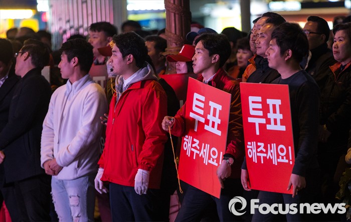 (창원=포커스뉴스) 4.13총선 선거운동 마지막날인 12일 오후 경남 창원시 상남분수광장에서 열린 강기윤 새누리당 창원 성산구 후보 선거유세에 참석한 강 후보 지지자들이 투표를 독려하는 손팻말을 들고 있다.