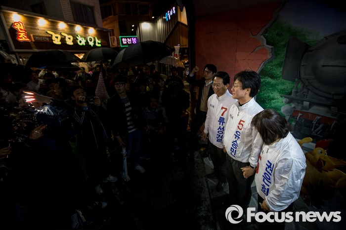 (대구=포커스뉴스) 권은희(오른쪽부터) 무소속 대구 북구갑 후보, 유승민 무소속 대구 동구을 후보, 류성걸 대구 동구갑 후보가 12일 오후 대구광역시 동구 평화시장 닭똥집골목에서 마무리 합동유세를 마친 뒤 손을 잡고 있다.