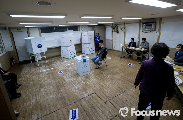 (부산=포커스뉴스) 제20대 국회의원선거일인 13일 오전 부산 영도구 동삼1동 제6투표소에서 유권자들이 투표하고 있다.